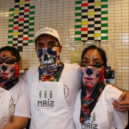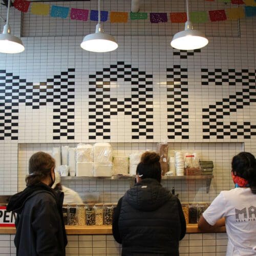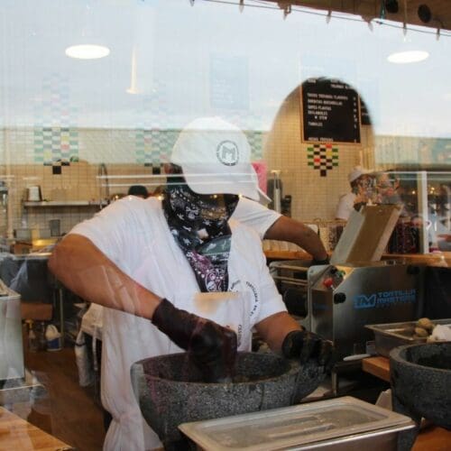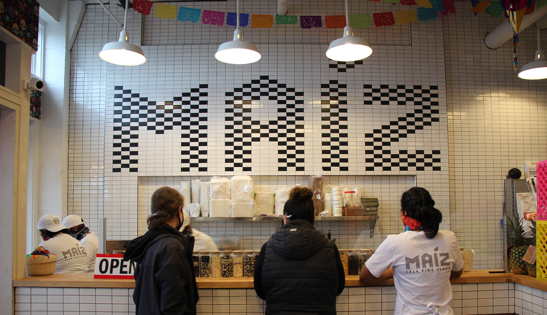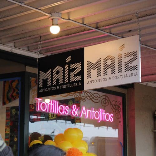 Maíz is a tortilla shop (tortillería) offering light Mexican dishes (antojitos mexicanos). They focus their menu on nixtamalization, a traditional maize preparation process, using Mexican native criollo corn tortillas and products. Maíz produces non-GMO, stone-ground masa for tortillas using 100% nixtamal at their street eatery.