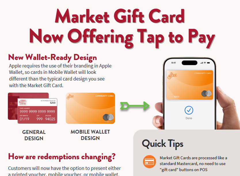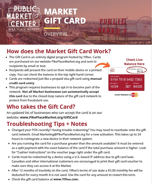 The Pike Place Market PDA has partnered with Yiftee, a digital gift card platform, to offer a Market-wide gift card redeemable at any participating business that registers. This is an easy way to attract patrons to your business and establish a broader customer base at no extra cost to you!