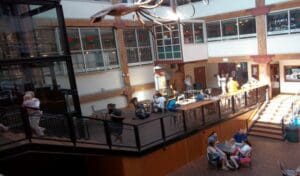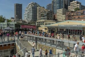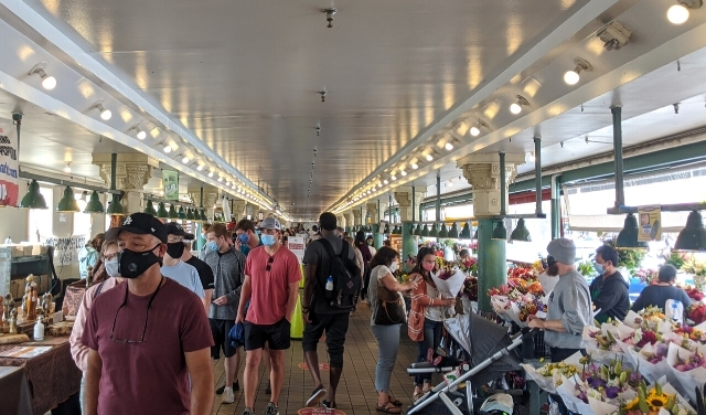 With construction complete, the configuration of the Market looks much like it does today. A branch of the Seattle Public Library opens on the lower floor.