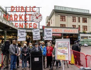 Stalls are added thanks to a $10,000 contribution from the City of Seattle. The Sanitary Market building opens as well.
