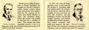 Frank Goodwin brought his nephew, Arthur Goodwin, into his business early on and the two worked closely to manage the Market. In 1926, Arthur bought out Frank with other investors to create Pike Place Public Markets, Inc. By this time, the Goodwins were nationally recognized as experts in market design and operations. Arthur Goodwin sat on the advisory boards for markets in San Francisco, Portland, and Bremerton, Washington, and in 1929 he published Markets: Public and Private, Their Establishment and Administration – a book that discusses management practices at markets throughout the country and is still considered a definitive work on the management of public and private markets.