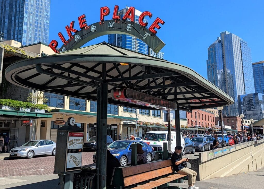 It’s located on the west side of the pergola at the north end of Pike Place Market. Look for the yellow dots on the ground indicating the space. (Map It)