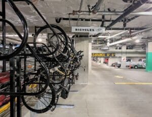 There are several bicycle racks throughout Pike Place Market. The largest rack holds 34 bikes and is located in our Red Garage, P6.